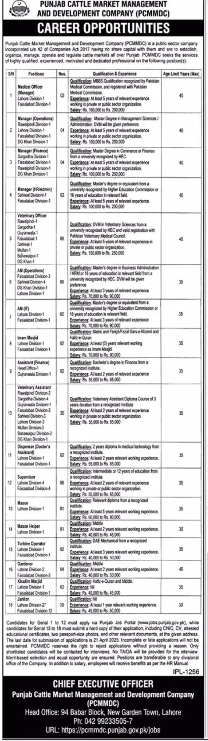 The Punjab Cattle Market Management and Development Company (PCMMDC) is inviting applications for various positions across Punjab, offering competitive salaries and benefits. Below are the full details of the available positions, qualifications, experience requirements, and other essential information.
